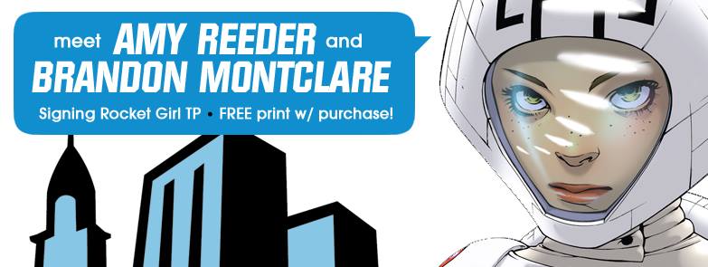 Writer Brandon Montclare and artist Amy Reeder appear at Midtown Comics Downtown on Wednesday, July 9th at 6:30 pm for a signing of their new Rocket Girl TP from Image Comics! Amy and Brandon will also be giving away a free 11×17 print to anyone who purchases the book!