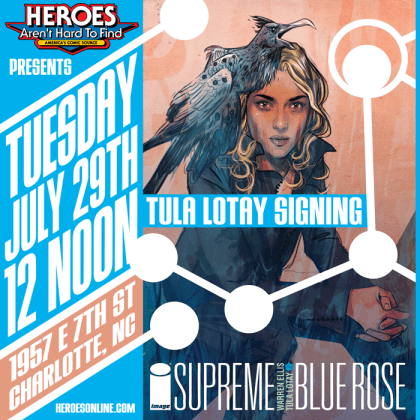 Artist Tula Lotay appears at Heroes Aren’t Hard To Find for her only 2014 scheduled U.S. appearance besides SDCC! Lotay, artist of the Warren Ellis penned Supreme: Blue Rose will be signing copies of this exciting first issue from Image Comics at the store on Tuesday, July 29, 2014 at 12 noon. Plan to spend your lunch break at Heroes that day!