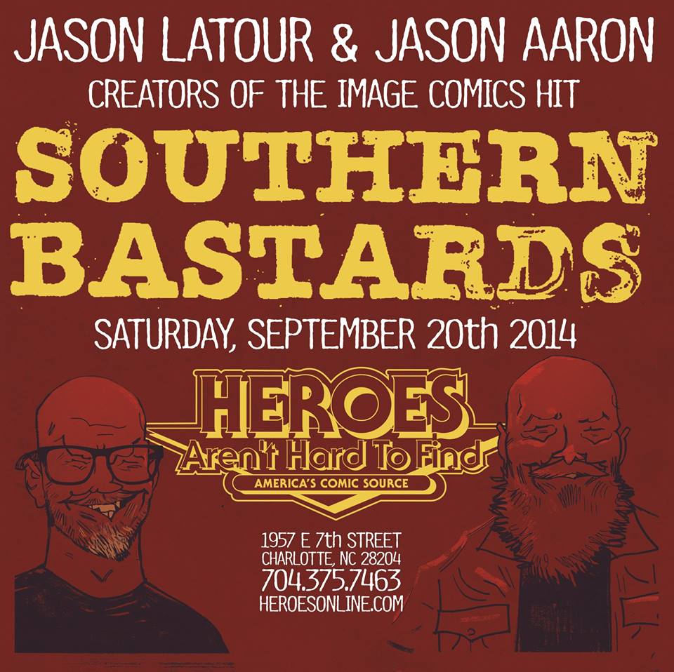 Writer Jason Aaron and artist Jason Latour appear at Heroes Aren’t Hard To Find on Saturday September 20th from 2:00 – 5:00 pm to sign their Image Comics hit SOUTHERN BASTARDS!