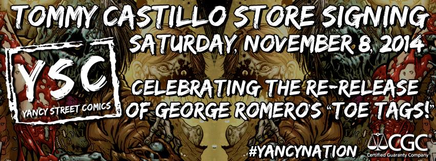 Artist Tommy Castillo appears at Yancy Street Comics on Saturday, November 8th at noon to sign the re-release of George Romero’s TOE TAGS graphic novel!