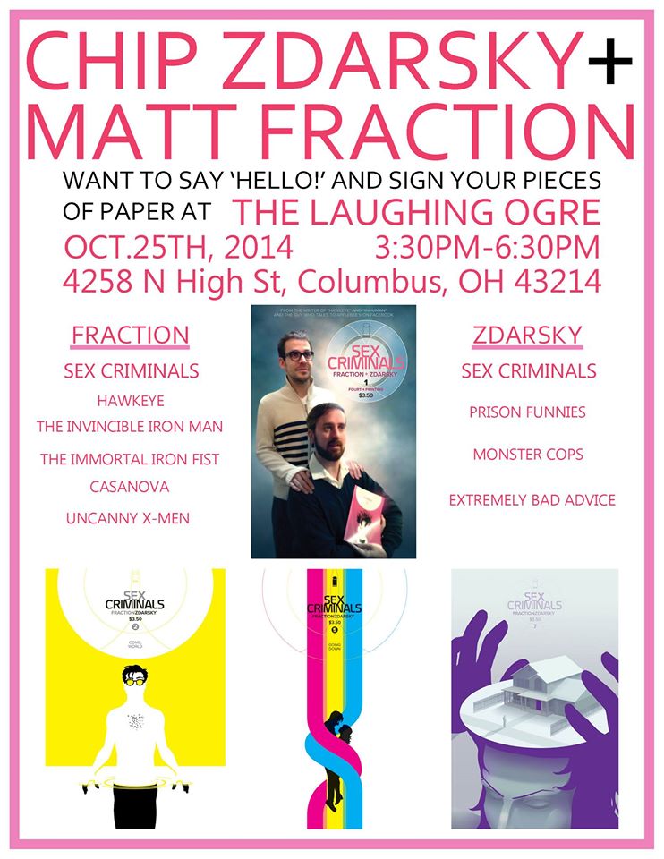 Writer Matt Fraction and artist Chip Zdarsky, the Eisner award-winning team behind Time Magazine’s Graphic Novel of the Year, Image Comics’ SEX CRIMINALS, appear at Laughing Ogre Comics for a signing on Saturday October 25, 2014 from 3:30 – 6:30 PM! And be sure to check out Matt and Chip giving a speech at Columbus College of Art & Design on Thursday October 23rd from 7:00 pm – 10:00 pm. See link for details.