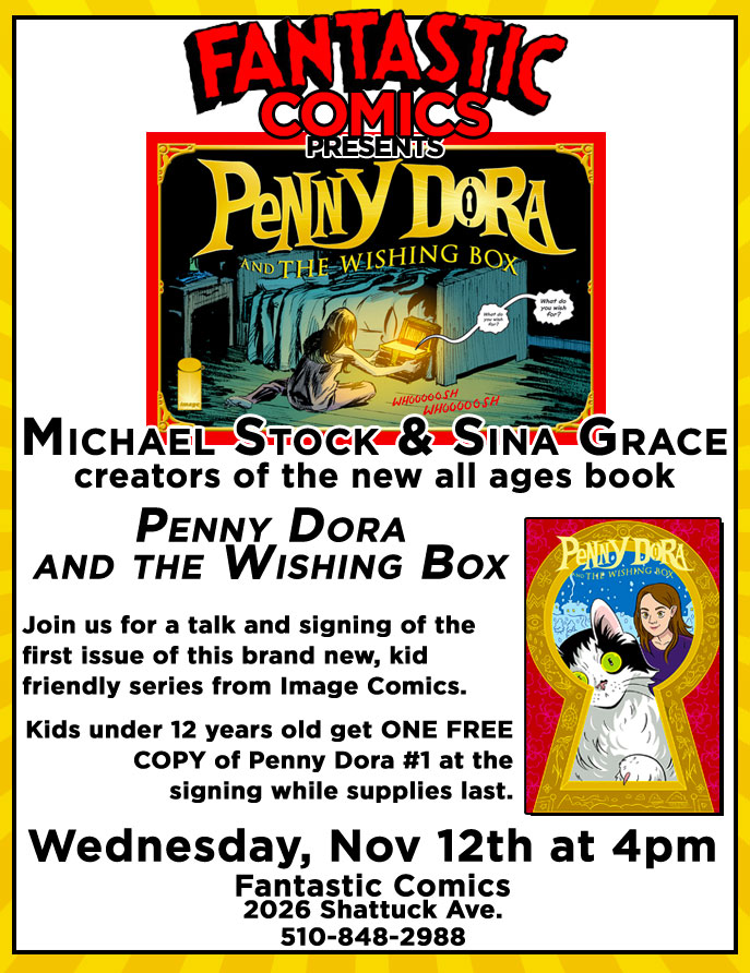 Michael Stock and Sina Grace, creators of the new all ages book Penny Dora and the Wishing Box, appear at Fantastic Comics on Wednesday, November 12th, starting at 4:00 PM!