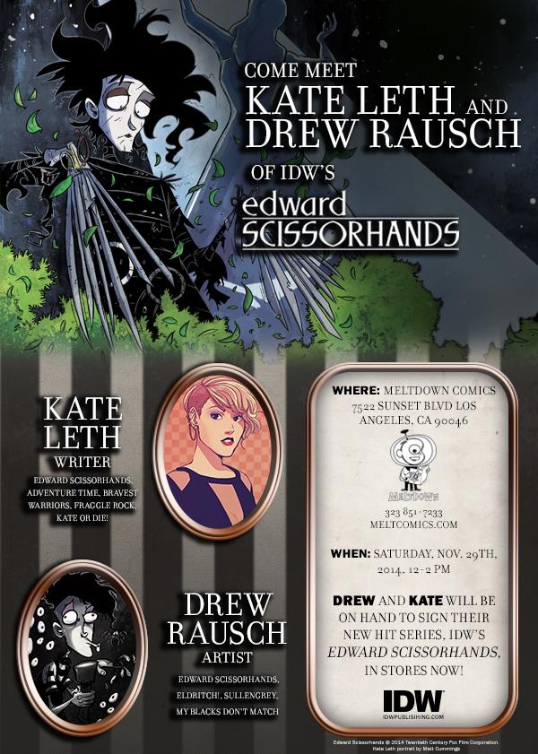 Writer Kate Leth and artist Drew Rausch appear at Meltdown Comics on Saturday November 29, 2014 from noon till 2:00 PM to sign the new Edward Scissorhands comic from IDW.