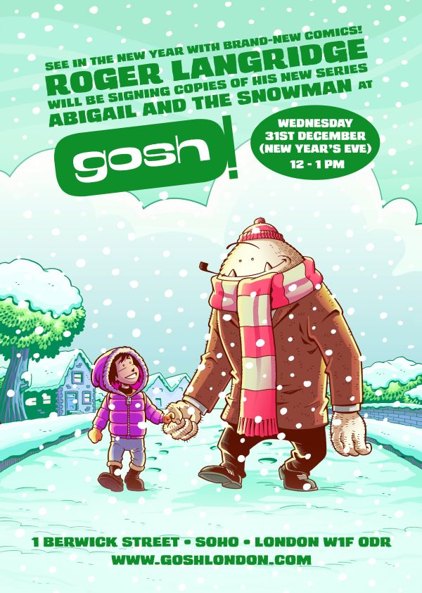 Roger will be joining us between 12pm and 1pm on the 31st of December, the perfect excuse to get out of the house/office on New Year’s Eve and come collect the new releases! Issue #1 of Abigail and the Snowman retails at £2.85. If you’d like a copy put aside or signed on your behalf then send an email to info@goshlondon.com, otherwise see you there!