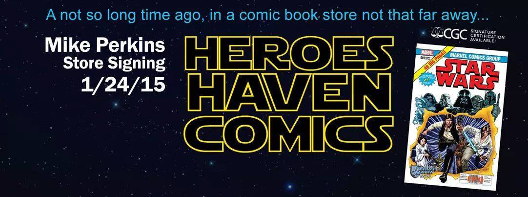 Mike Perkins, Jamie Jones, Scott Blair, Ozzy Fernandez, John Rivett, and Jen Mercer appear at Heroes Haven on Saturday, January 24, 2015 from 11:00 AM – 6:00 PM to celebrate the release of Marvel’s new Star Wars series! Get a store exclusive variant cover of the first issue with art by Perkins!
