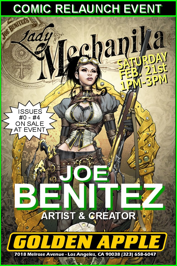Creator/Artist Joe Benitez appears atĀ Golden Apple Comics on Saturday February 21, 2015 from 1:00 till 3:00 PM to celebrate the relaunch of LADY MECHANIKA!