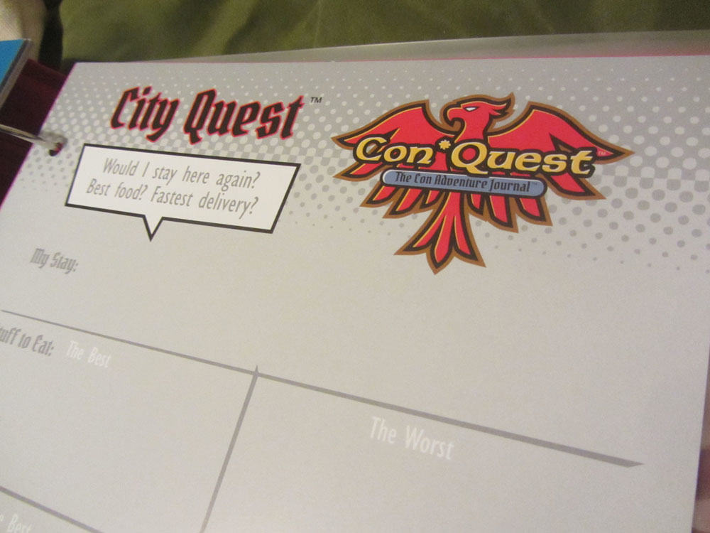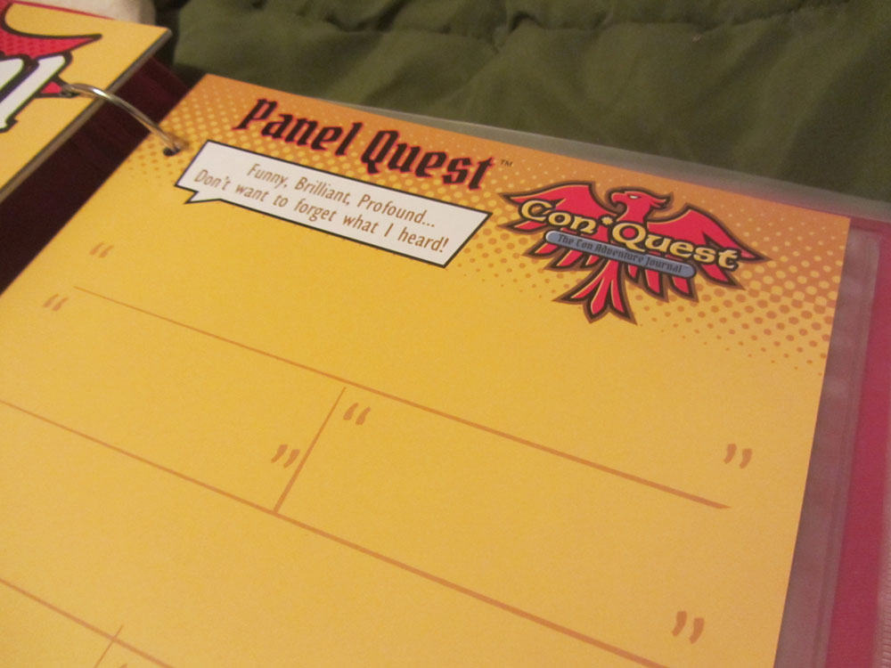 I think the Con*Quest Adventure Journal is a clever idea (I wish we had thought of it!). The graphics strike me as a bit kid-oriented so I’m not sure I would pick up one for myself of this version, but I could definitely see getting copies if you are taking your kids with you to conventions.