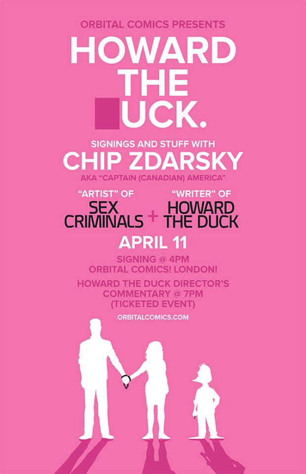 Orbital Comics is wildly excited to be hosting Applebee’s favourite son, Chip Zdarsky, for a very exclusive UK signing on Saturday, April 11, to celebrate his new HOWARD THE DUCK series, as well as the release of SEX CRIMINALS Volume 2. Chip will be engaging in signings & ‘stuff’ from 4-6pm, then doing a HOWARD THE DUCK Director’s Commentary after-hours from 7pm. The commentary will be ticketed, with tickets available free with a purchase – more details to follow. This is Chip’s first and only appearance in the United Kingdom, so don’t miss out!