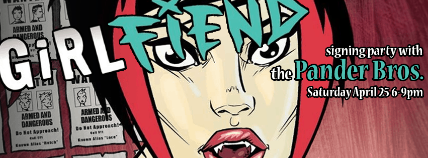 With Girlfiend, The Pander Bros return to the comics medium in what is being lauded as their best work yet! On Saturday April 25th come pick up your copy of this new 280-page vampire crime thriller and have it signed by the creators; reviewers have said it’s “pretty awesome in a really bloody kind of way.” We’ll also have t-shirts available for purchase, free refreshments, and the Girlfiend herself will be on hand!