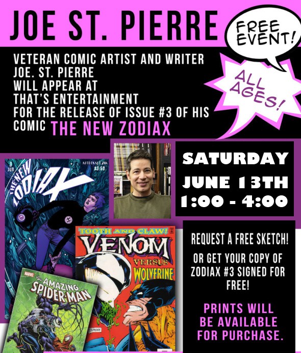 Joe St. Pierre, veteran comic artist and writer, appears at That’s Entertainment from 1:00 p.m. to 4:00 p.m on Saturday, June 13th to celebrate the release of issue #3 of his comic book, The New Zodiax.