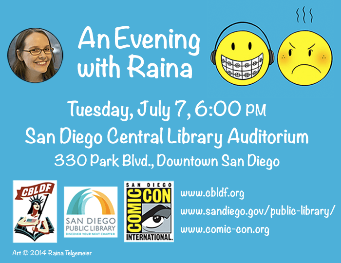 This popular comics creator is a special guest at Comic-Con International this year, but you don’t have to have a badge to see her in this special early appearance at the San Diego Central Library! “An Evening with Raina,” co-sponsored by Comic-Con and the Comic Book Legal Defense Fund, on Tuesday, July 7 at 6:00 PM in the Auditorium, located at 330 Park Blvd., in downtown San Diego. Admission is free, but seating is limited for this special event. CBLDF will have books available for donations.