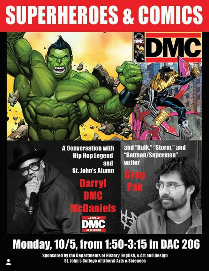 Hip-hop icon Darryl “DMC” McDaniels and writer Greg Pak (Totally Awesome Hulk, Storm, Batman/Superman) speak about comic books at St. John’s University on Monday October 5, 2015 from 1:50 – 3:15 PM in the D’Angelo Center Room 206!