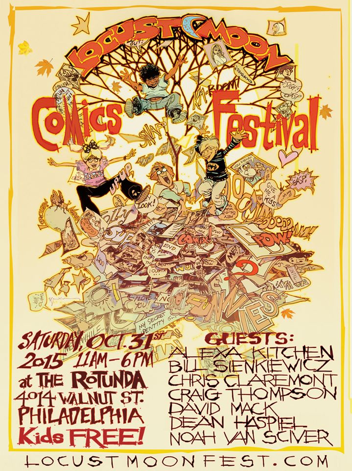 The Locust Moon Comics Festival, Philadelphia’s premiere celebration of comics, illustration, and the graphic arts, returns to the historic Rotunda, just off UPenn’s campus, on Saturday October 31st from 11:00 AM till 6:00 PM. This year’s guests include Craig Thompson (Space Dumplins, Blankets), Chris Claremont (Uncanny X-Men, Wolverine), Noah Van Sciver (Fante Bukowski, Blammo), David Mack (Fight Club 2, Kabuki), Bill Sienkiewicz (Moon Knight, New Mutants), Dean Haspiel (The Quitter, The Fox), Alexa Kitchen and Denis Kitchen (Kitchen Sink Press), and more to be announced throughout September.