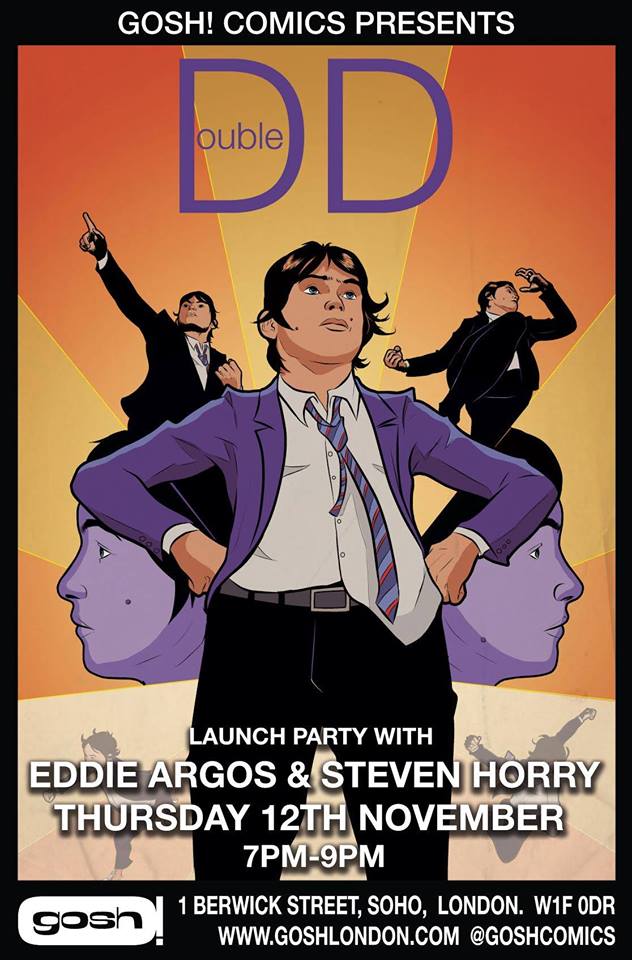 Double D is written by artist, writer and Art Brut singer Eddie Argos. He’s released four albums, with the two most recent being produced by Black Francis of The Pixies. He’s also written for The Guardian, NME, This Is Fake DIY, Geekweek and Blackbooks We’ll also be joined by Double D artist Steven Horry. Steve is not only an excellent artist but also a musician and DJ. He’s the creator of the Britpop club night Nuis@nce and has worked with small press publishers like Nasty Little Press and Avery Hill Publishing.