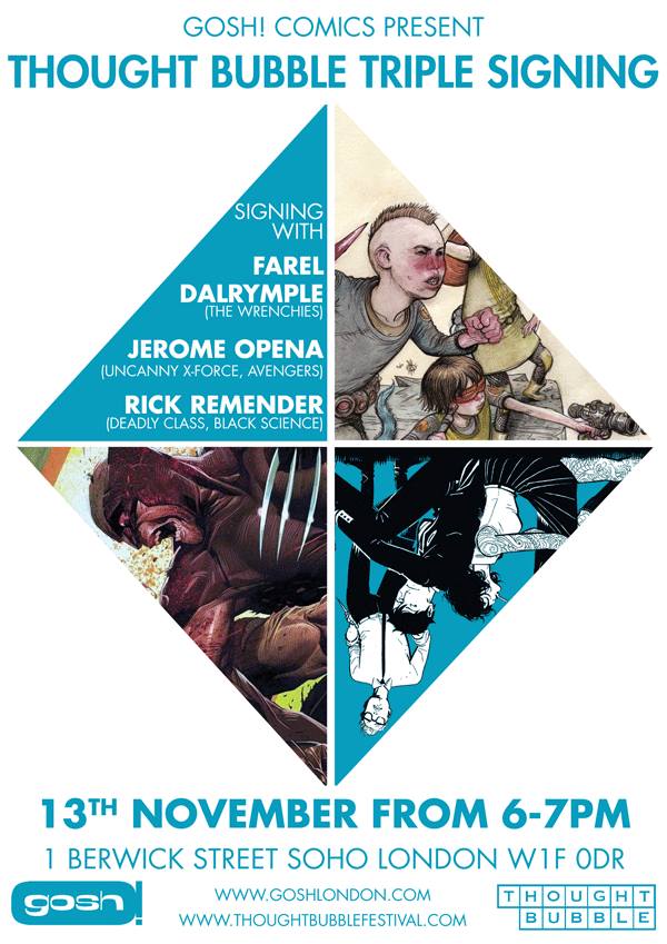 Farel Dalrymple (The Wrenchies), Jerome Opeña (Uncanny X-Force, Avengers) and Rick Remender (Deadly Class, Black Science) appear at Gosh! Comics for signing on Friday 13 November from 6:00 – 7:00 PM prior to their appearance at the Thought Bubble Festival.