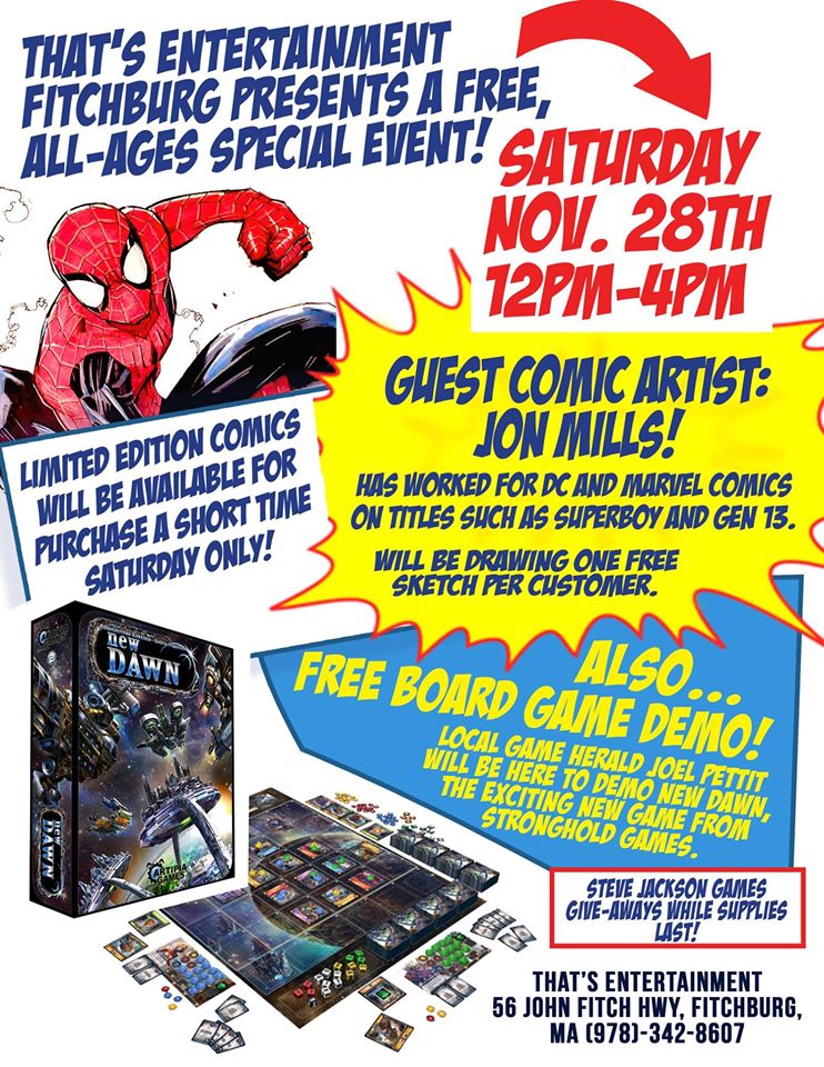 Comic artist Jon Mills appears at That’s Entertainment on Saturday November 28, 2015 from noon till 4:00 PM drawing one free sketch per a customer! He has worked for DC and Marvel comics on titles such as Superboy and Gen 13.