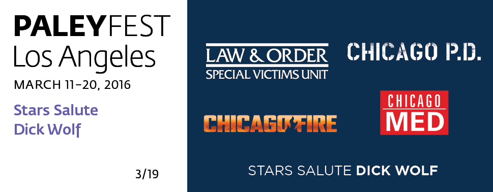 Jason Beghe, Sophia Bush, Colin Donnell, Ice-T, Taylor Kinney, S. Epatha Merkerson, Oliver Platt, Jesse Spencer and additional guests to be announced appear at PaleyFest on Saturday, March 19, 2016 at 7:00 PM to salute DICK WOLF, writer/producer of shows including Law & Order, Chicago Fire, Chicago P.D., Chicago Med!