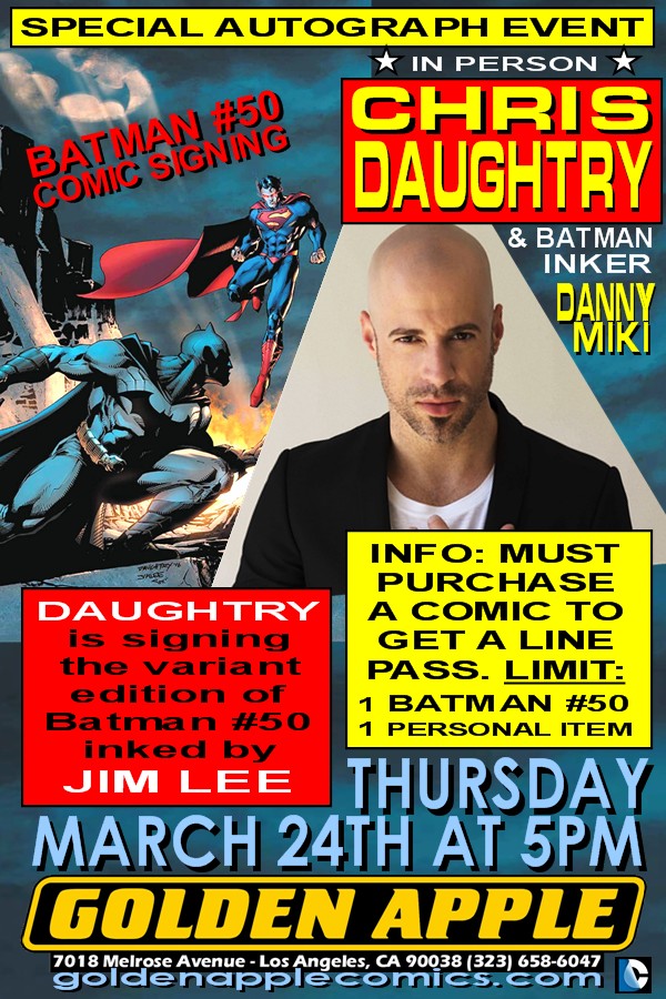 Singer Chris Daughtry (American Idol) and Batman inker Danny Miki appear at Golden Apple Comics on Thursday March 24th at 5:00 PM to sign Daughtry’s variant cover of BATMAN #50 (inked by Jim Lee) from DC Comics!
