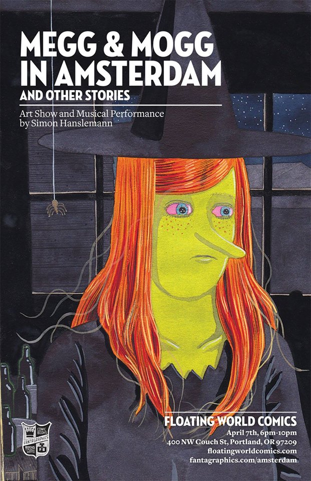 Simon Hanselmann appears at Floating World Comics on Thursday April 7, 2016 from 6:00 – 10:00 PM for the Megg & Mogg In Amsterdam and Other Stories release party, art exhibit & musical performance.