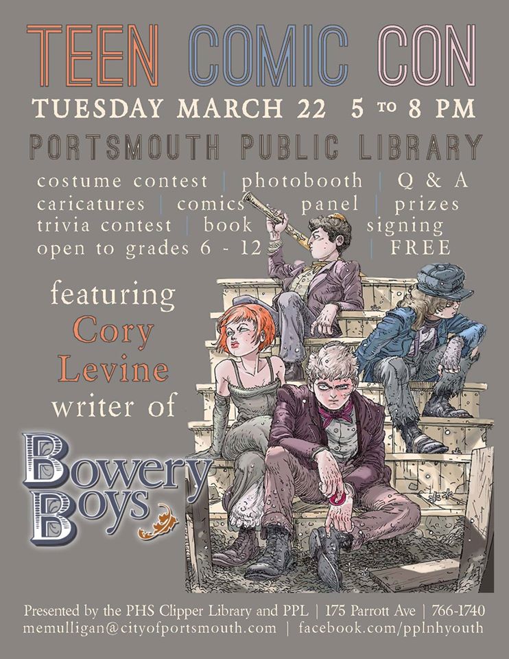 Teens grades 6 – 12 are invited to a FREE Comic Con at the Portsmouth Public Library on Tuesday, March 22, 2016 from 5:00 – 8:00 PM. Our featured guest is Cory Levine, Author of Bowery Boys.