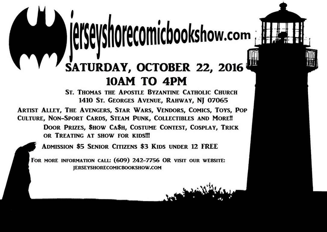 | Come out and join us for what promises to be an exciting show in Rahway, New Jersey! The show is being held at St. Thomas the Apostle Byzantine Catholic Church 1410 St. Georges Avenue, Rahway, NJ 07065. The show will run from 10am to 4pm. Artist Alley featuring over 20+ artists, writers and creators of comics and more than 40 vendors offering up comics from the Golden Age to Present, graphic novels, non-sport cards, toys, pop culture, steam punk, anime, collectibles and so much more! Swag bags for the first 100 people! Door prizes! $how Ca$h drawings! Costume Contest! AND…there will be Trick or Treating at the show for all youngsters attending!!! Admission is $5 Senior Citizens $3 Children under 12 FREE |