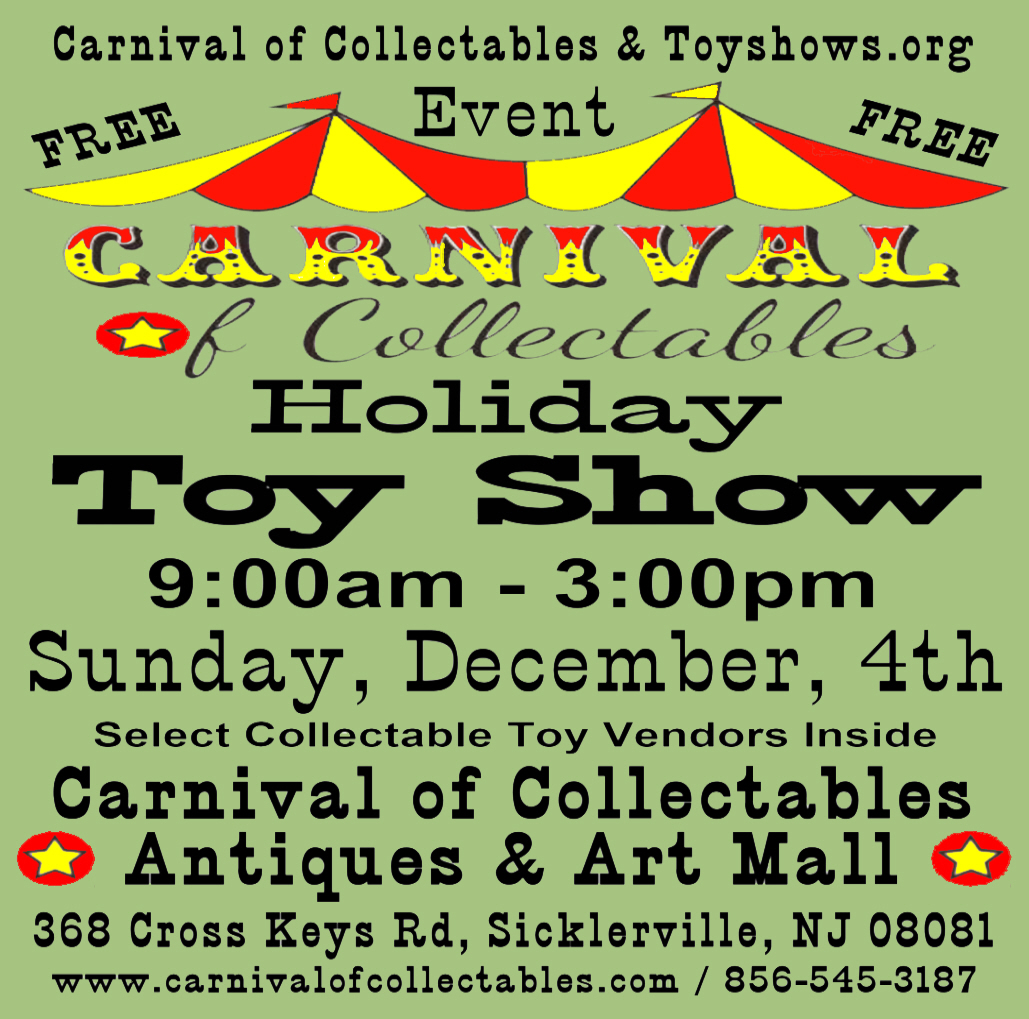 | On Sunday, December, 4th, 2016 ToyShows.Org presents The first Carnival of Collectables Holiday Toy Show at Carnival of Collectables antiques & art mall, 368 Cross Keys Road. Sicklerville, N.J. 08081 from 9:00am to 3:00 pm. Selected Toy vendors with New, Collectible and Vintage Toys will be setting up inside Carnival of Collectables, Come shop for that hard to find gift for the collector who has everything. The Mall features over a hundred antiques and art vendors. Next to the Peddlers Warehouse indoor flea market. Free Admission, Free Parking. For information about Carnival of Collectables. Call the Store: 856-545-3187. or go to www.carnivalofcollectables.com |