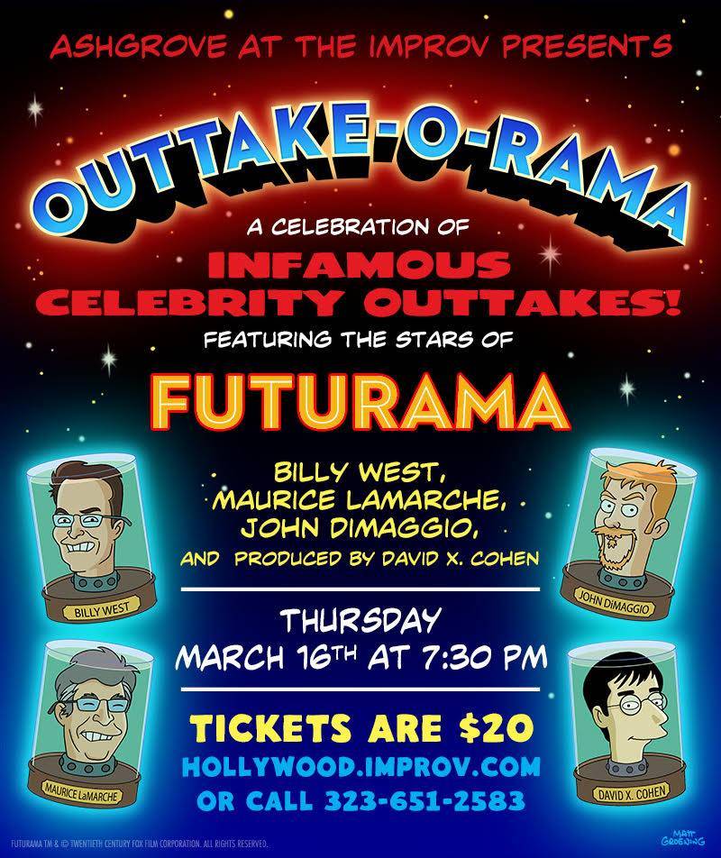 Futurama stars John DiMaggio, Billy West, and Maurice LaMarche plus Executive Producer David X. Cohen and host Jessica Marshall-Gardiner appear at the Hollywood Improv on Thursday, March 16, 2017 at 7:30 PM! Hot off of sold-out shows… don’t miss this chance to experience the most horrifically entertaining treasures ever mistakenly put down on tape by William Shatner, Richard Nixon, and many more.