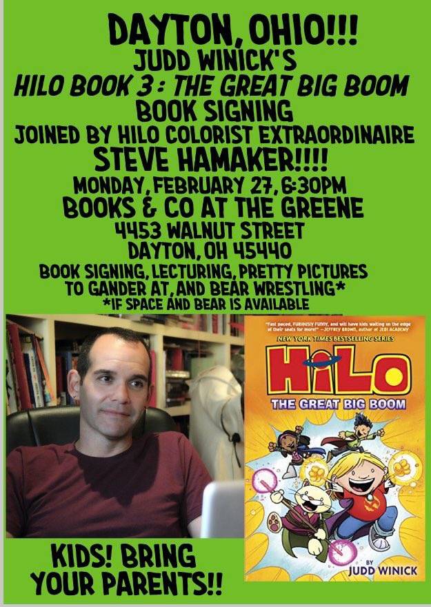 Cartoonist Judd Winick (Green Lantern, Green Arrow, Exiles) and colorist Steve Hamaker appear at Books & Co. on Monday, February 27, 2017 at 6:30 PM to sign HILO: THE GREAT BIG BOOM!