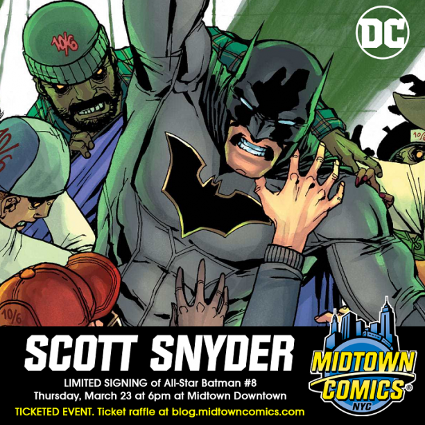 Writer Scott Snyder (American Vampire, Swamp Thing, Wytches) will visit Midtown Comics Downtown on Thursday March 23, 2017 at 6:00 PM to sign All-Star Batman #8! This is a TICKETED EVENT. Enter the ticket raffle here…