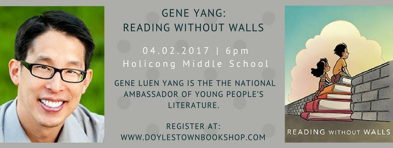 The Doylestown Bookshop and Holicong Middle School are excited to welcome Gene Luen Yang, the National Ambassador of Young People’s Literature, to Holicong Middle School on Sunday, April 2 2017 at 6:00 PM. You must register for the event at the link. Admission is free.
