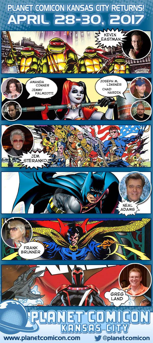 Once again, we couldn’t be more excited about the hundreds of writers and artists that will be appearing at Planet Comicon Kansas City in 2017. They include fan favorites of current and classic comics, up-and-coming new talents, syndicated cartoonists, best-selling novelists, small press publishers, and alternative and indie voices.