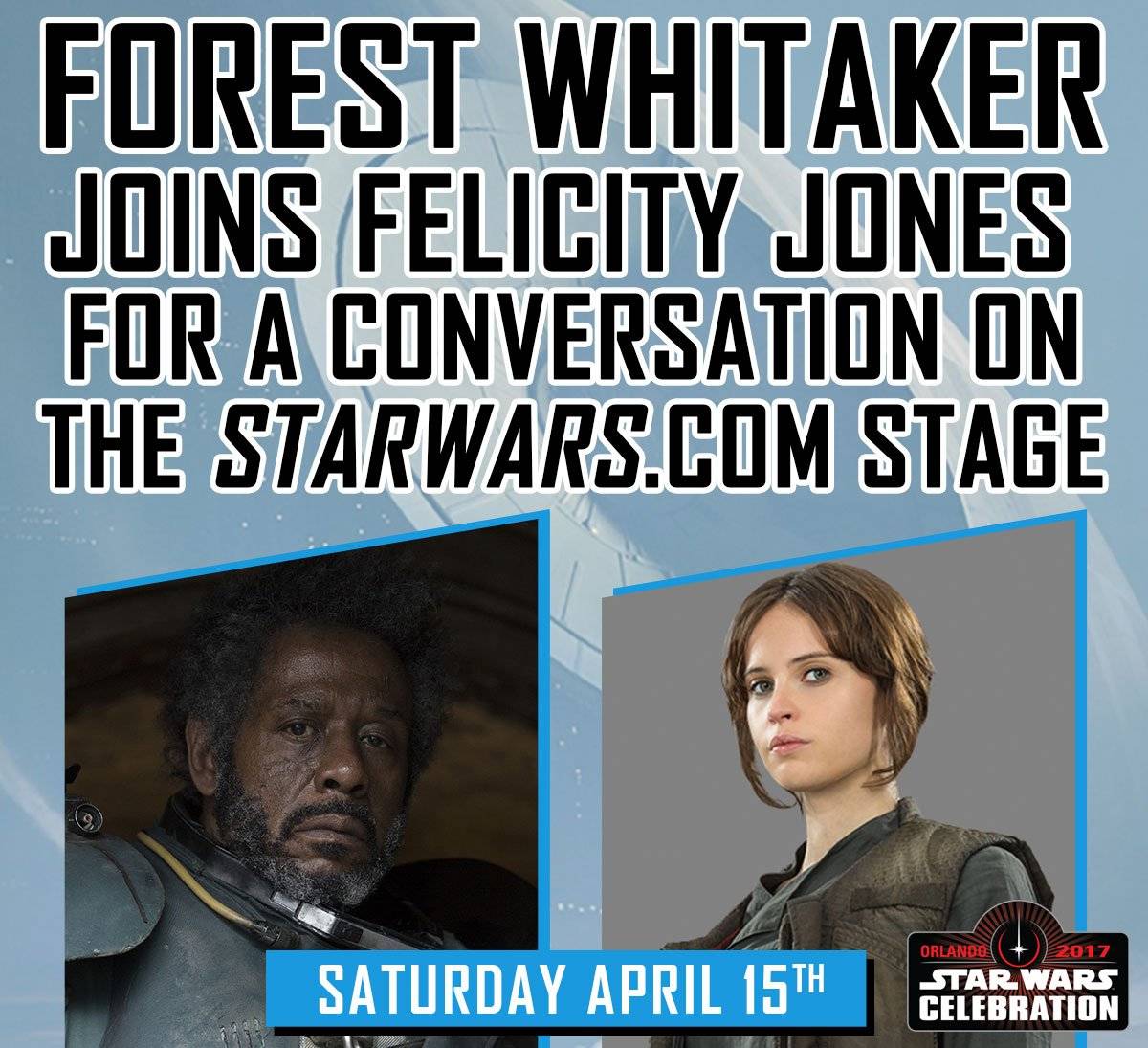 Academy Award-winner Forest Whitaker joins Rogue One co-star Felicity Jones on the StarWars.com stage for a conversation on Saturday April 15th at Star Wars Celebration!