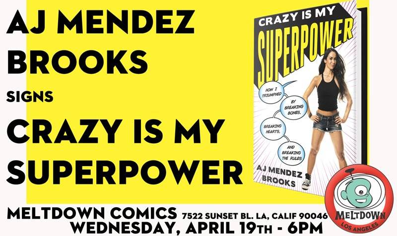 WWE Superstar AJ Mendez Brooks will sign her new book Crazy is My Superpower on Wednesday, April 19th at 6:00 PM at Meltdown Comics.