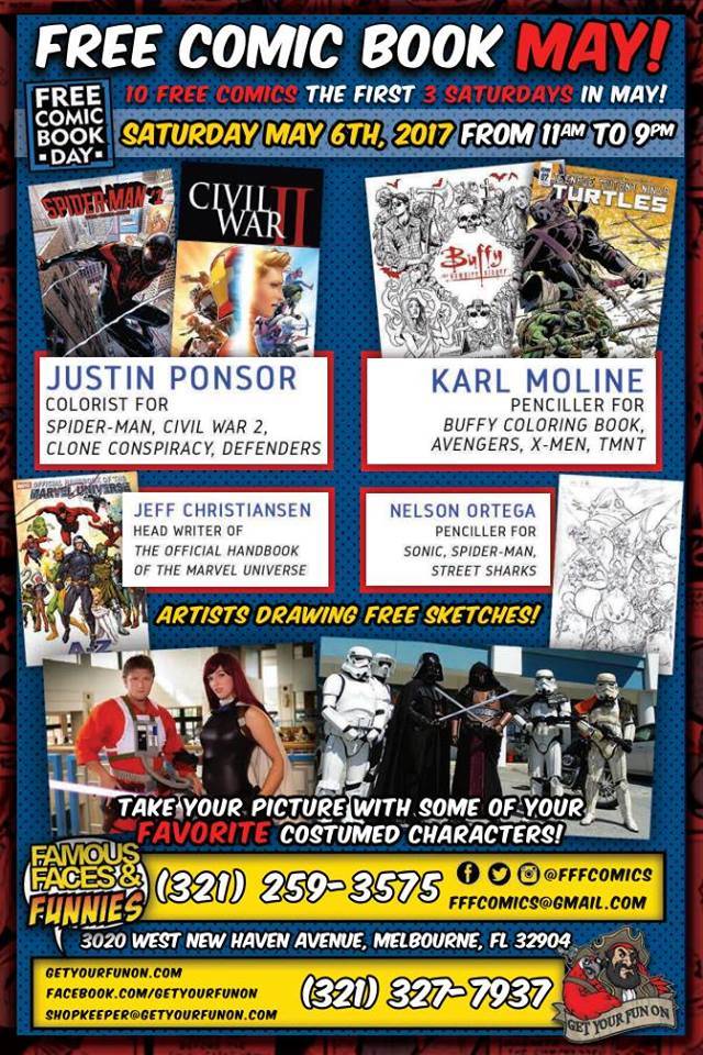 Karl Moline (penciler for Buffy, Avengers, and X-Men), Justin Ponsor (colorist for Star Wars, Amazing Spider-Man, Uncanny X-Men), Jeff Christensen (head writer of the Official Handbook of the Marvel Universe), and Nelson Ortega (penciler for Sonic, Spider-Man) appear at Famous Faces and FunniesĀ on Saturday May 6, 2017 to celebrate Free Comic Book Day!