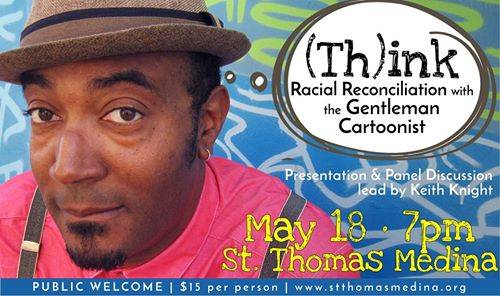 Join St. Thomas Medina on Thursday, May 18th at 7:00 PM as nationally renowned cartoonist, social activist, father and educator, Keith Knight, leads us through a presentation and panel discussion on racial reconciliation. With laughter and thoughtful discussions, we’ll consider how to build loving, inclusive, and resilient communities in a diverse range of social, cultural, and political contexts.
