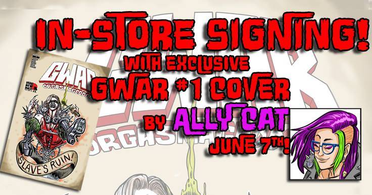 Artist Ally Cat appears at Brave New Worlds on Wednesday, June 7th at 11:00 AM – 1:00 PM to sign the exclusive variant cover of GWAR Orgasmageddon #1!