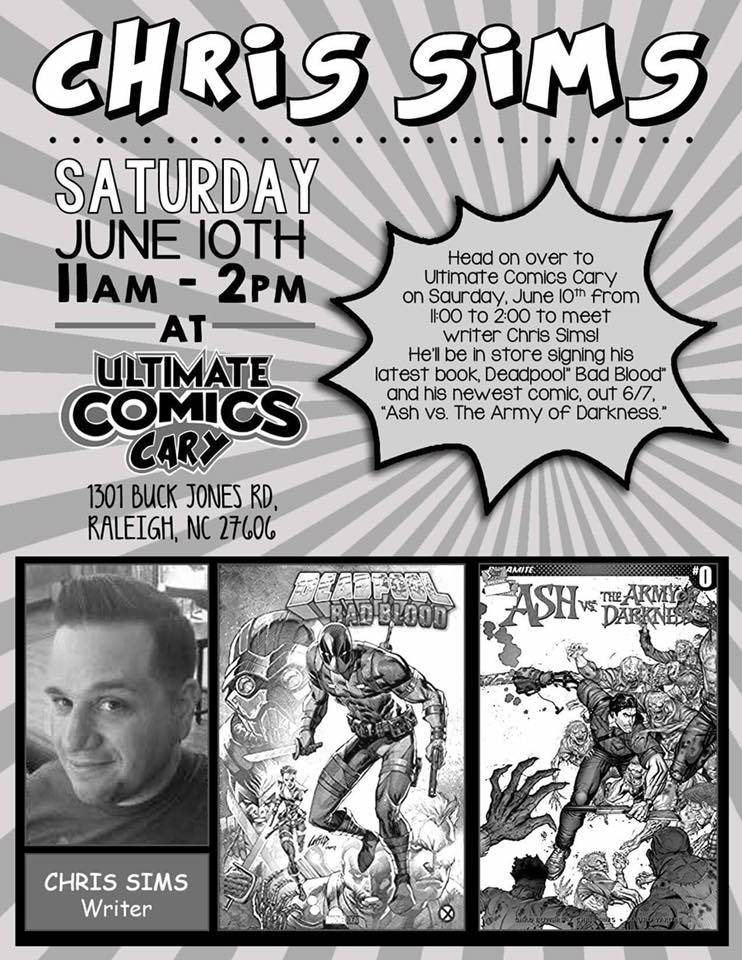 Writer Chris Sims (X-Men ’92) signs at Ultimate Comics’s Cary location on Saturday June 10th from 11:00 AM – 2:00 PM to sign both Deadpool: Bad Blood and Ash vs Army of Darkness #0.