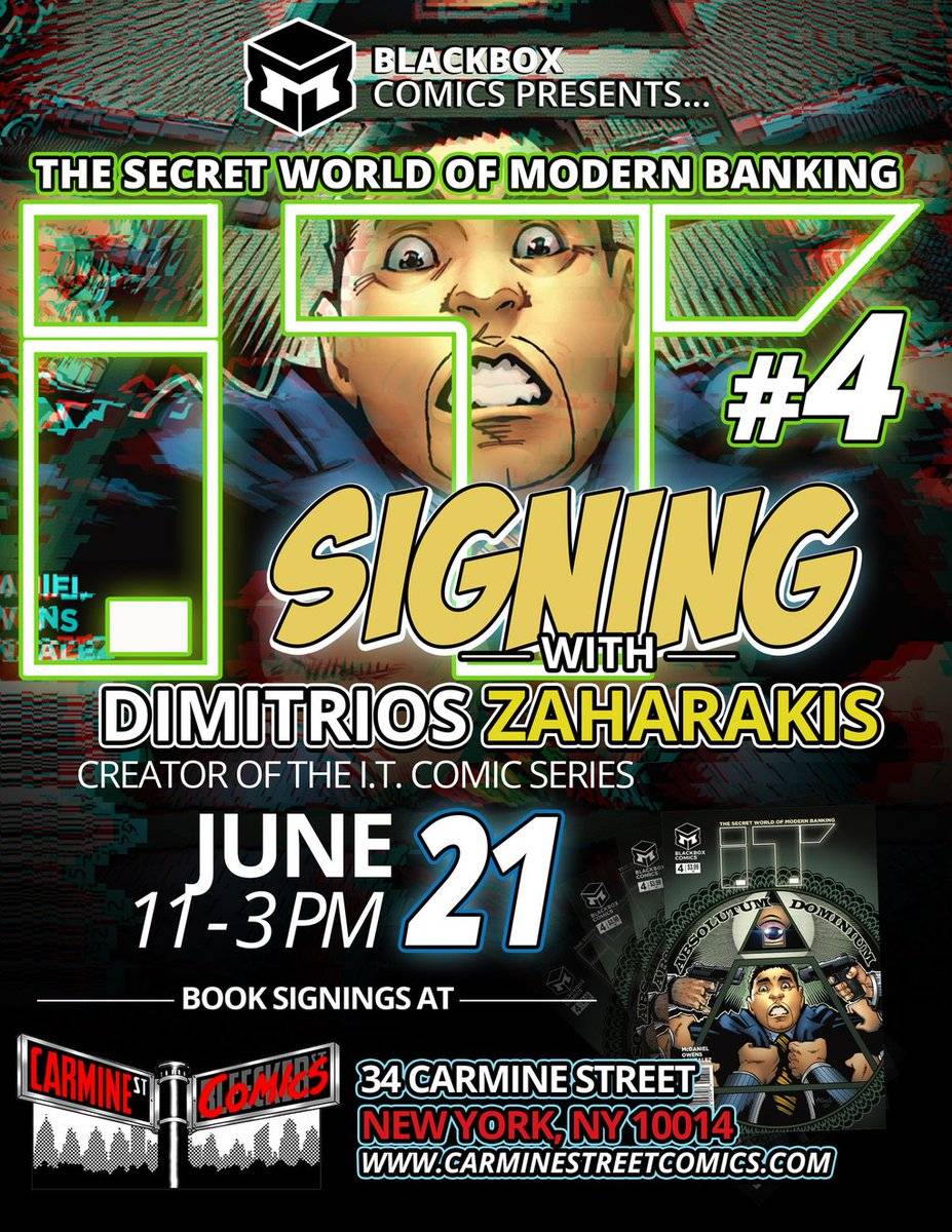 Dimitrios Zaharakis appears at Carmine Street Comics on Wednesday, June 21, 2017 from 11:00 AM till 3:00 PM to sign I.T. – The Secret World of Modern Banking from BlackBox Comics!