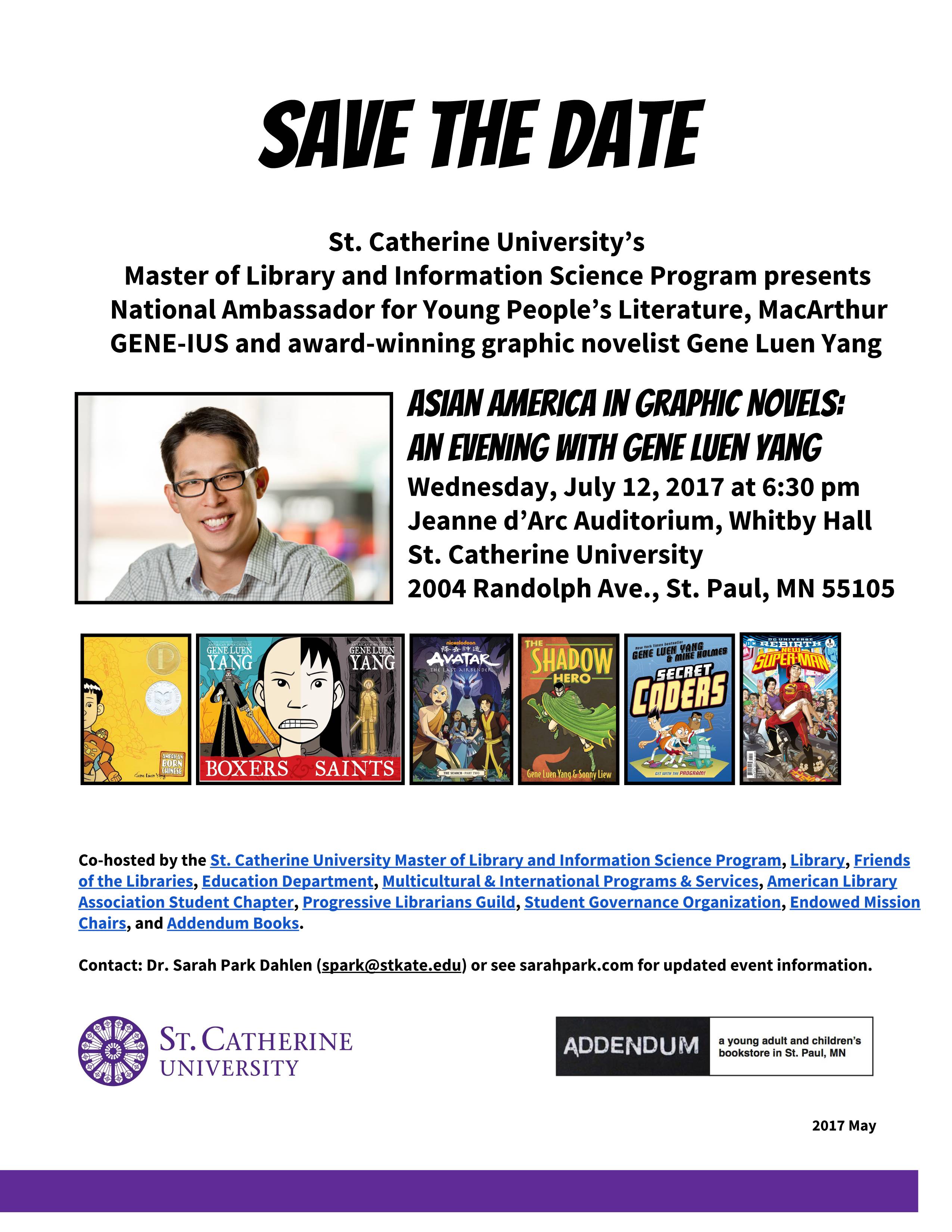 Co-hosted by the St. Catherine University – MLIS Program, St. Kate’s Library, Friends of the Libraries, Education Department, St. Catherine University MIPS Office, St. Kate’s ALA Student Chapter, Progressive Librarians Guild, Student Governance Organization, Endowed Mission Chairs, and Addendum Books.