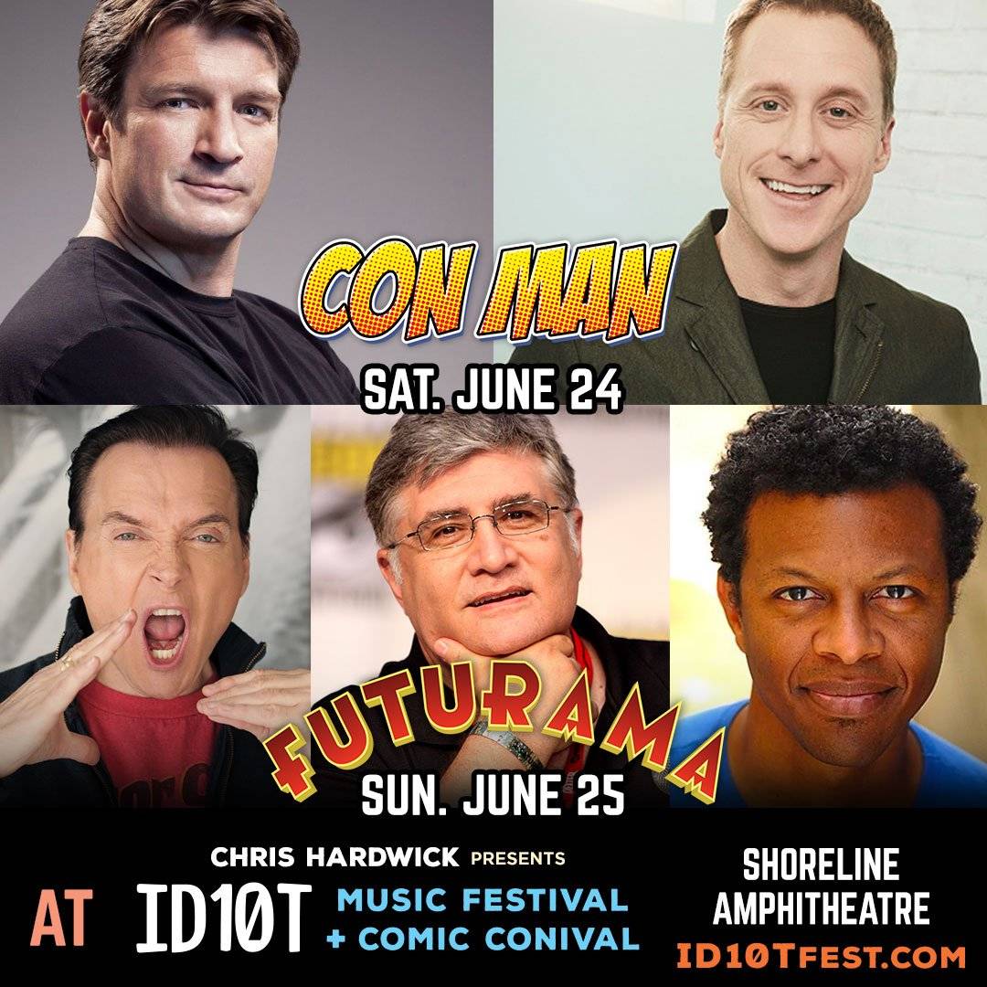 Chris Hardwick’s Id10t Music Festival + Comic Conival, has added panels featuring the stars of Con Man, Animaniacs, and Futurama to their schedule for this weekend’s festival at the Shoreline Amphitheatre and the surrounding grounds in Mountain View, CA on Saturday, June 24 and Sunday, June 25th!