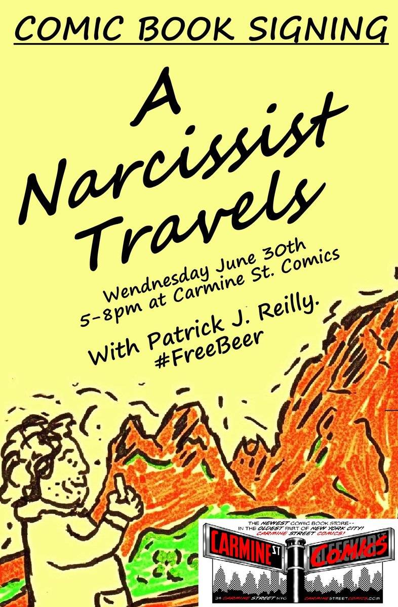 Cartoonist Patrick J. Reilly appears at Carmine Street Comics on Wednesday June 28th at 5:00 PM to sign his new comic A Narcissist Travels.