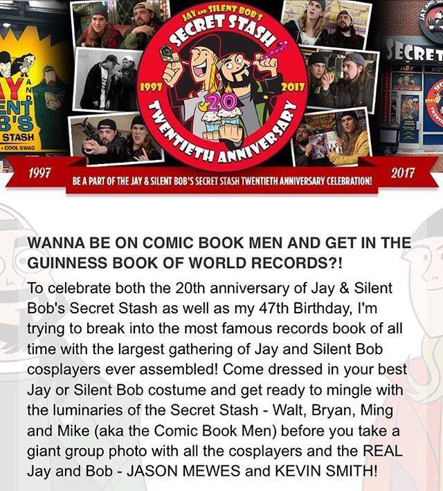 Kevin Smith is inviting Jay & Silent Bob cosplayers to hang with him to celebrate both his 47th birthday and the Secret Stash’s 20 anniversary in Red Bank, NJ on AUGUST 5th!