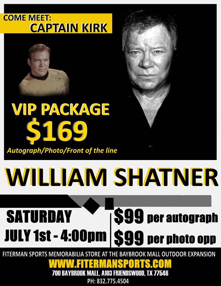 $169 – VIP….photo opp, 1 autograph, fast pass and 8×10 photo of Mr. Shatner (PRE-SALE ONLY) (ONLY 50 AVAILABLE)