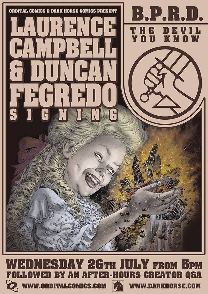 Artist Laurence Campbell and cover artist Duncan Fegredo appear at Orbital Comics on Wednesday 26th July beginning at 5:00 PM to celebrate the launch of the third story arc from Mike Mignola’s B.P.R.D. series The Devil You Know from Dark Horse.