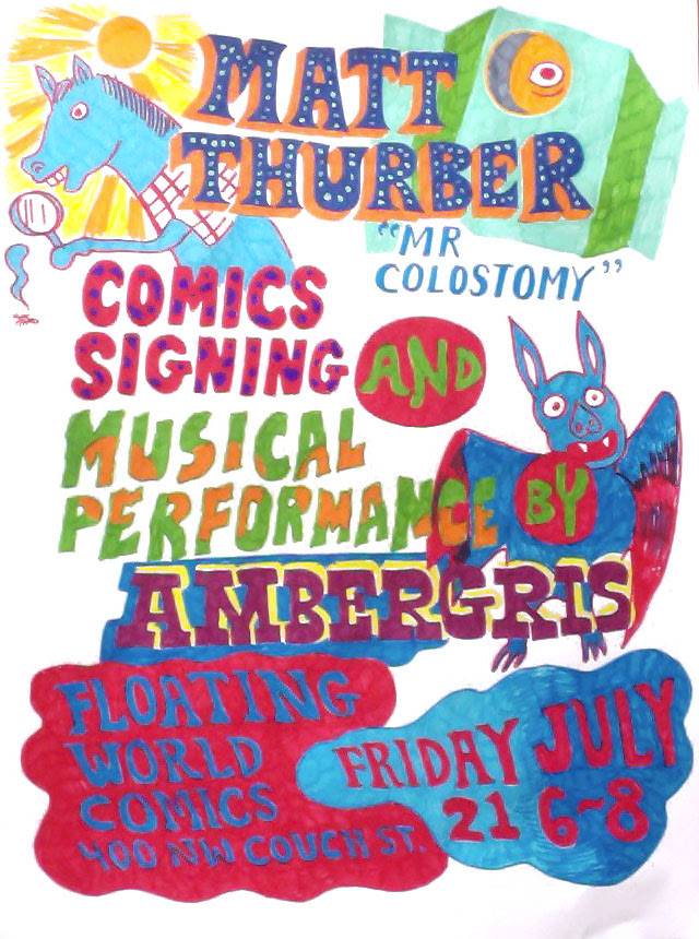 Matt Thurber (aka Mr. Colostomy, aka Ambergris) appears at Floating World Comics for a comic signing and Ambergris performance on Friday July 21, signing at 6:00 PM, performance at 7:00 PM.