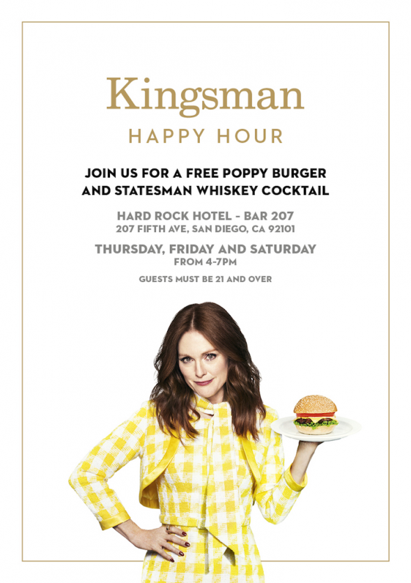 Get a free poppy burger and Statesman whiskey cocktail during the Kingsman Happy Hour. The event takes place at the Hard Rock Hotel from 4-7 pm on Thursday, Friday, and Saturday this week. Must be 21 or over.