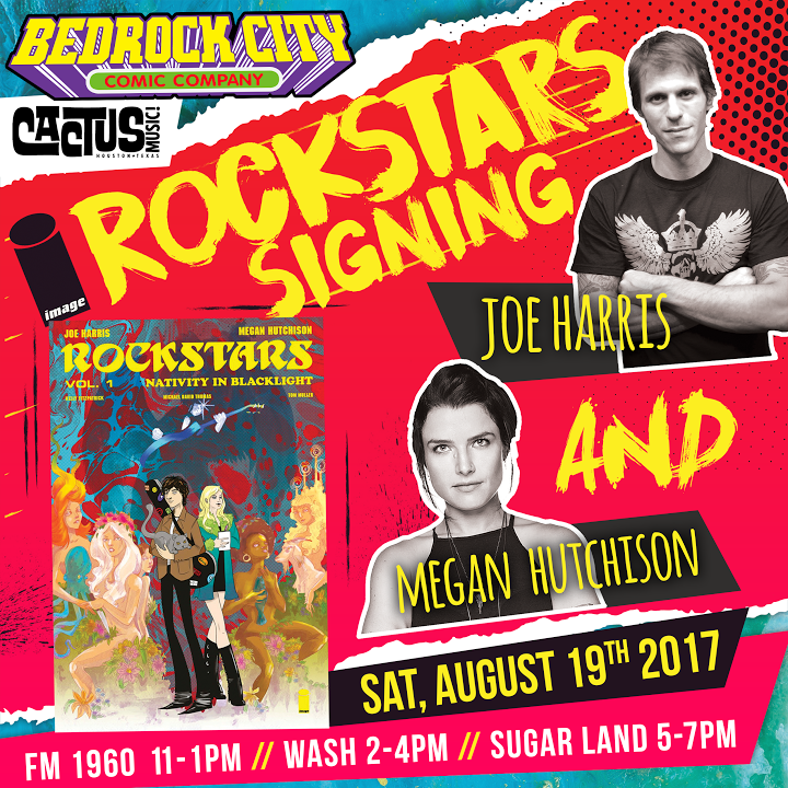 Writer Joe Harris and artist Megan Hutchison, creators of ROCKSTARS, appear at all three Bedrock City Comics Co. locations on Saturday August 19th to sign, sketch, sell prints, and share with you some of the great ROCK CONSPIRACY THEORY stories every told!