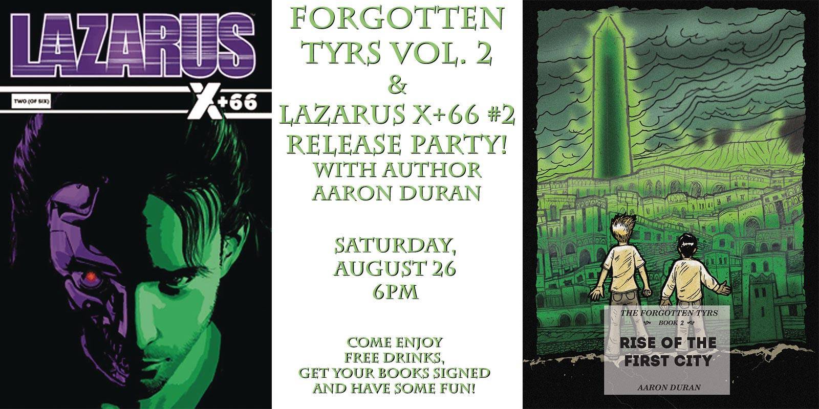 Duran will be signing copies of Lazarus X+66 #2 (his debut comic with Image Comics) as well as copies of The Forgotten Tyrs Volume 2: Rise of the First City, the second volume in his Grizzlydale young adult novel series. Copies of both will be available for purchase (as well as copies of his first Forgotten Tyrs novel). This signing is all ages and refreshments will be provided for free!
