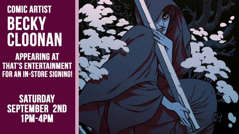 Acclaimed comic book creator Becky Cloonan will appear for a reception and signing event at That’s Entertainment in Worcester on Saturday, September 2nd from 1:00 till 4:00 PM. Cloonan will be signing comics and other memorabilia. She will be selling prints and pins at her table. The event is free and open to the public, and all ages are welcome.