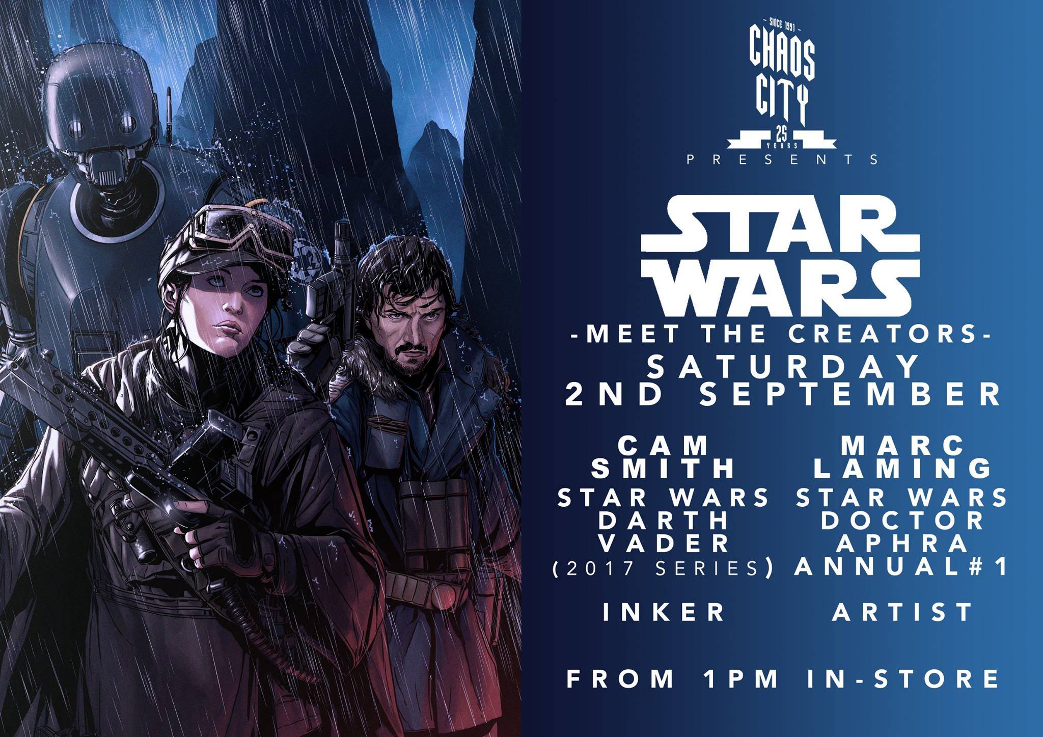 Artists Cam Smith (Darth Vader) and Marc Laming (Doctor Aphra Annual) appear at Chaos City Comics on Saturday September 2nd at 1:00 PM.
